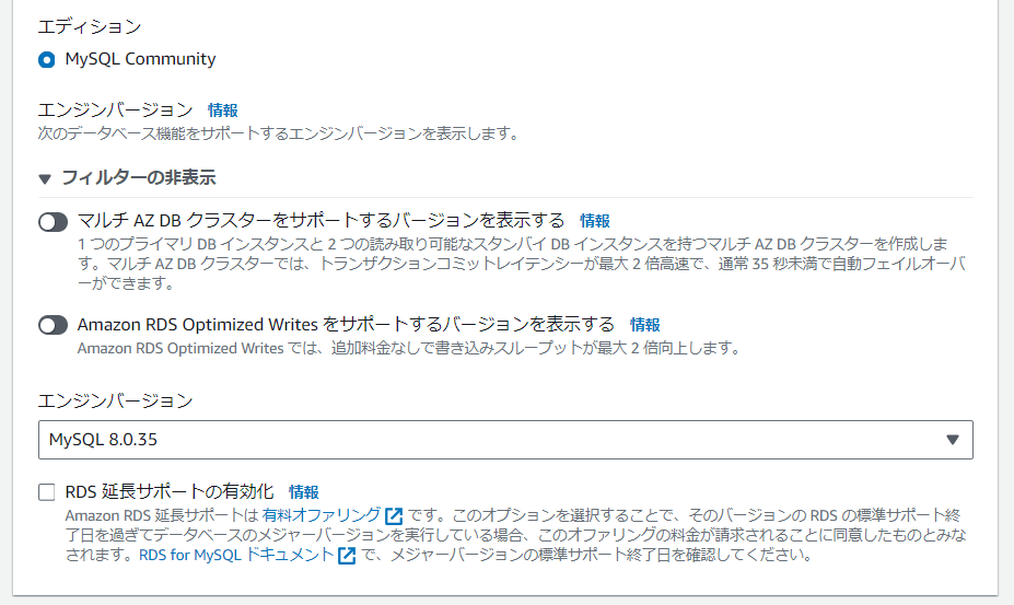 なお、エディションは「MySQL Community」、エンジンバージョンは最新のものを選択しましょう。