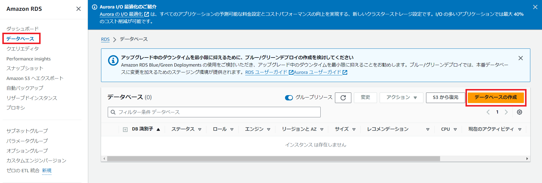 まずは、RDSダッシュボード画面の左にある「データベース」のリンクをクリックし、データベースの一覧画面に遷移しましょう。