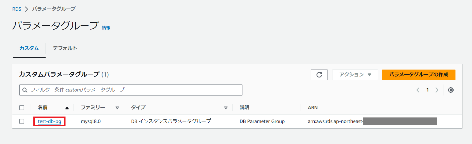作成後、一覧上に作成したパラメータグループが表示されています。