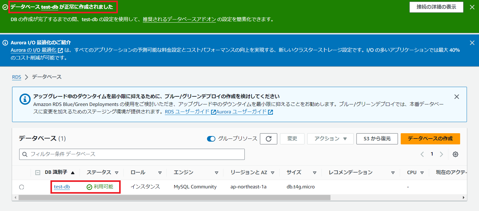 まずは、先程作成したDBサーバ(test-db)の管理画面にアクセスし、エンドポイントを確認しておいてください。