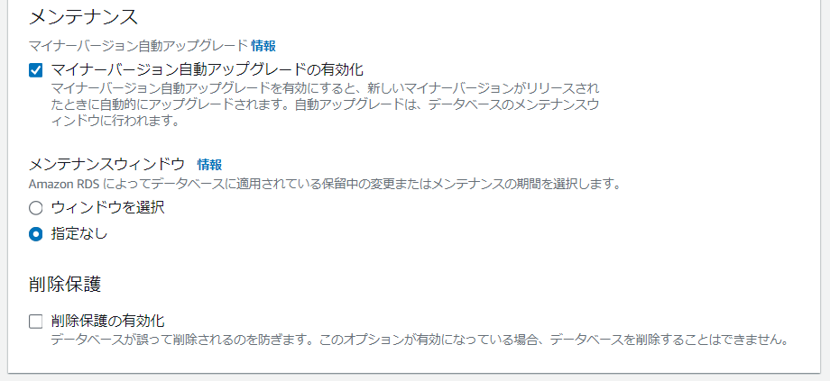 ・パラメータグループファミリー:mysql8.0(※選択したエンジンタイプのバージョン)