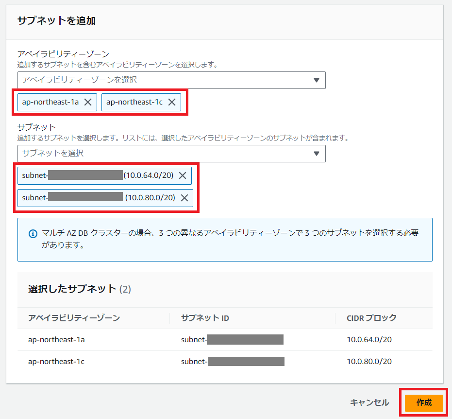よって、ここでは2つのアベイラビリティゾーン「ap-northeast-1a」「ap-northeast-1c」を指定し、そこに配置した2つのプライベートサブネットを選択します。