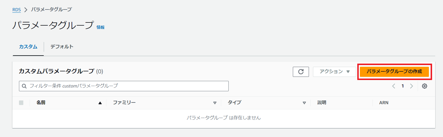 この時点では、まだグループが一つも存在しません。よって、「パラメータグループの作成」をクリックして新規作成します。